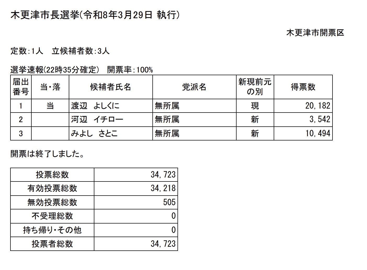 令和8年3月29日、木更津市長選挙が行われました。